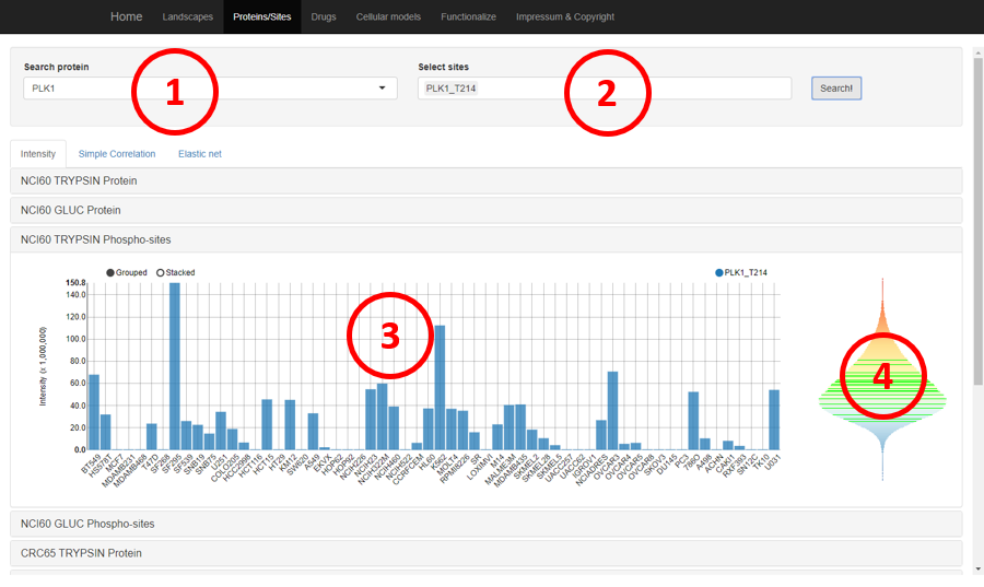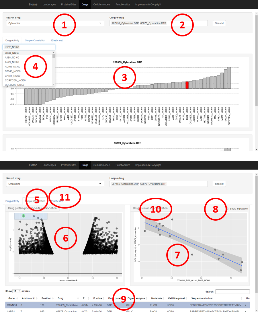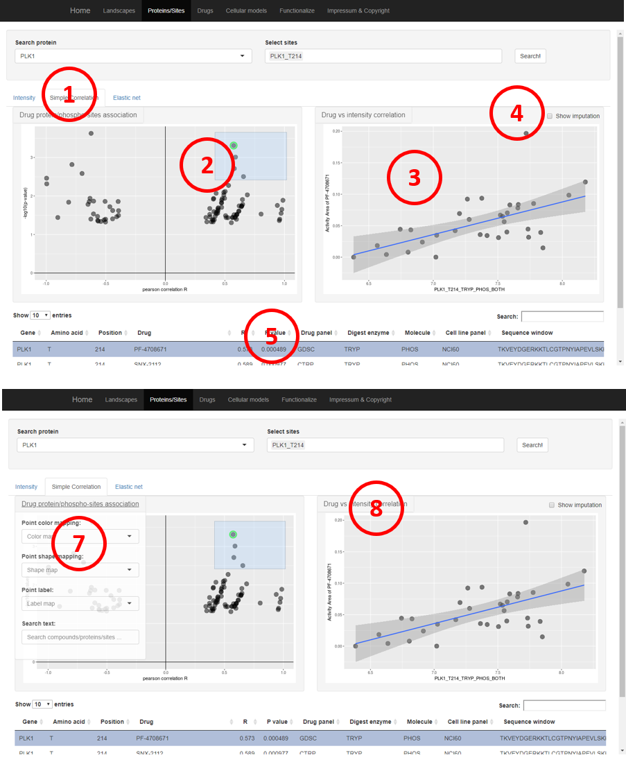 The drugs whose responses are correlated with protein/site abundance could be explored from the tab “Simple correlation”.