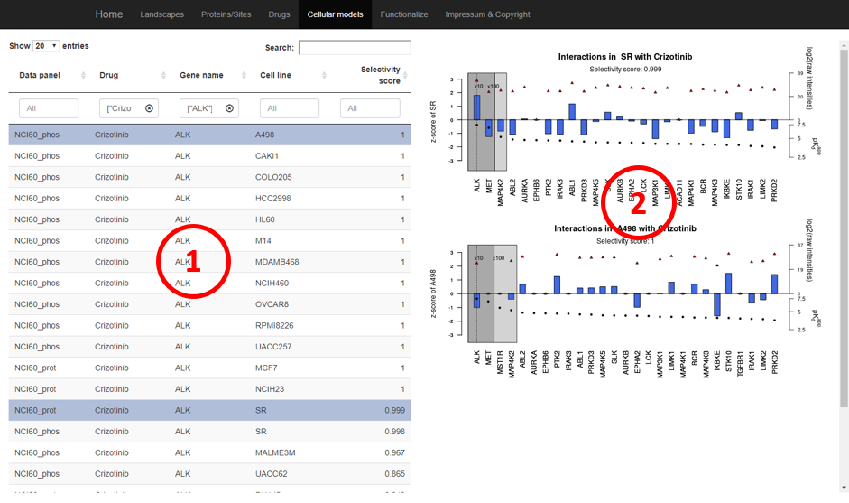 Click on one row will display a selectivity plot, which can be used for further evaluation of the selectivity score. Using the plot on top as an example, the targets of Crizotinib are ordered by binding strength (expressed by their pKdapp; log10 of the apparent Kd values; black dots; right bottom y-axis). The shaded areas enclose kinases whose pKdapp values are within 10-fold (dark gray) or 100-fold (light gray) of the pKdapp of the most potent Crizotinib target ALK (Supplementary Methods for additional details). The left y-axis shows the z-scored intensities of kinases targeted by Crizotinib across the NCI60 panel as bars and their log2-transformed intensities as red triangles (right top y-axis). It is apparent that ALK is relatively more abundant than the next best Crizotinib targets MET and MAP4K2. In fact, ALK accounts for 99.9% of the proteomic abundance of the top three Crizotinib targets (expressed as a selectivity score), making ALK inhibition by far the most likely molecular target explaining the sensitivity of SR cells towards Crizotinib. A related analysis provided by the ATLANTiC web application is to select a protein of interest first, and the output is a set of kinase inhibitors and cell lines along with the same selectivity score, which can guide the selection of a suitable cell line to study the drug/protein interaction in more detail.